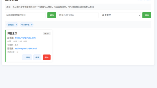 业务需要,某些业务二维码不便随意发给客户,解析二维码获得链接,使用链接跳转生成新链接再生成新的二维码,网上找了几个链接跳转服务和动态二维码之类的,都不符合预期,特别是有限期设定的功能,使用AI写了一个 示例:https://yangjinyou.com/page/dwz/redirect.php?c=BMGmwi # dwz 短网址服务(仅展示不发代码,AI写的,没有什么技术含量) ## 概述 - 一个轻量、可自部署的短网址(URL Shortener)与链接管理工具。 - 支持登录保护、链接创建/编辑/删除、到期…